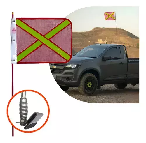 A bandeirola possui haste em fibra de vidro com 1,30m de altura, pintura eletrostática vermelha e bandeira refletiva vermelha no tamanho 40x30cm, garantindo máxima visibilidade em qualquer condição. O suporte é metálico, em formato de U invertido, projetado para encaixe direto no vidro lateral do veículo, fixação por pressão sem necessidade de ventosas, adesivos ou ferramentas.